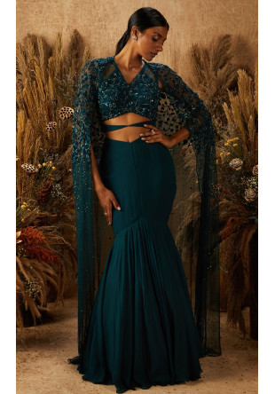 Dark green georgette fish-tail lehenga, paired with a stylized hand embellished crop and a separate detachable hand embellished net cape.