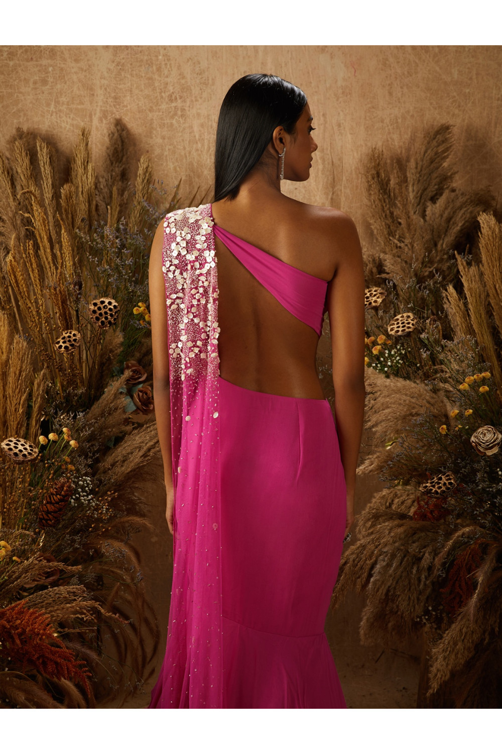 Hot-pink georgette cut-out fish style gown with layers at the bottom paired with a detachable tulle dupatta hand embellished with mixed mother of pearl and champagne materials.