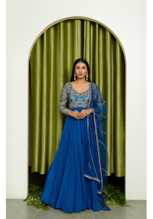 Ink-blue gathered anarkali with jewel tone resham, sequin, stone and pearl embroidery with a matching hand-embroidered net dupatta