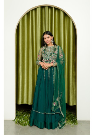 Teal-green long jacket with jewel tone french knotted resham, sequin, stone and pearl embroidery. It is paired with a matching skirt and hand-embroidered net dupatta