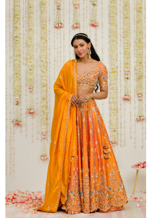 Rust-orange mirror thread and zardosi embroidered raw-silk lehenga paired with a matching deep neck geometric embroidered blouse and pure silk dupatta