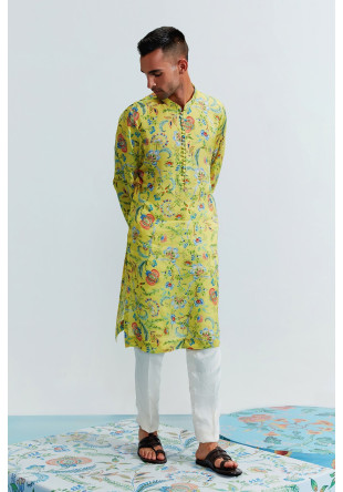 Yellow printed kurta in satin-organza with ivory satin-organza pants
