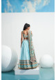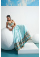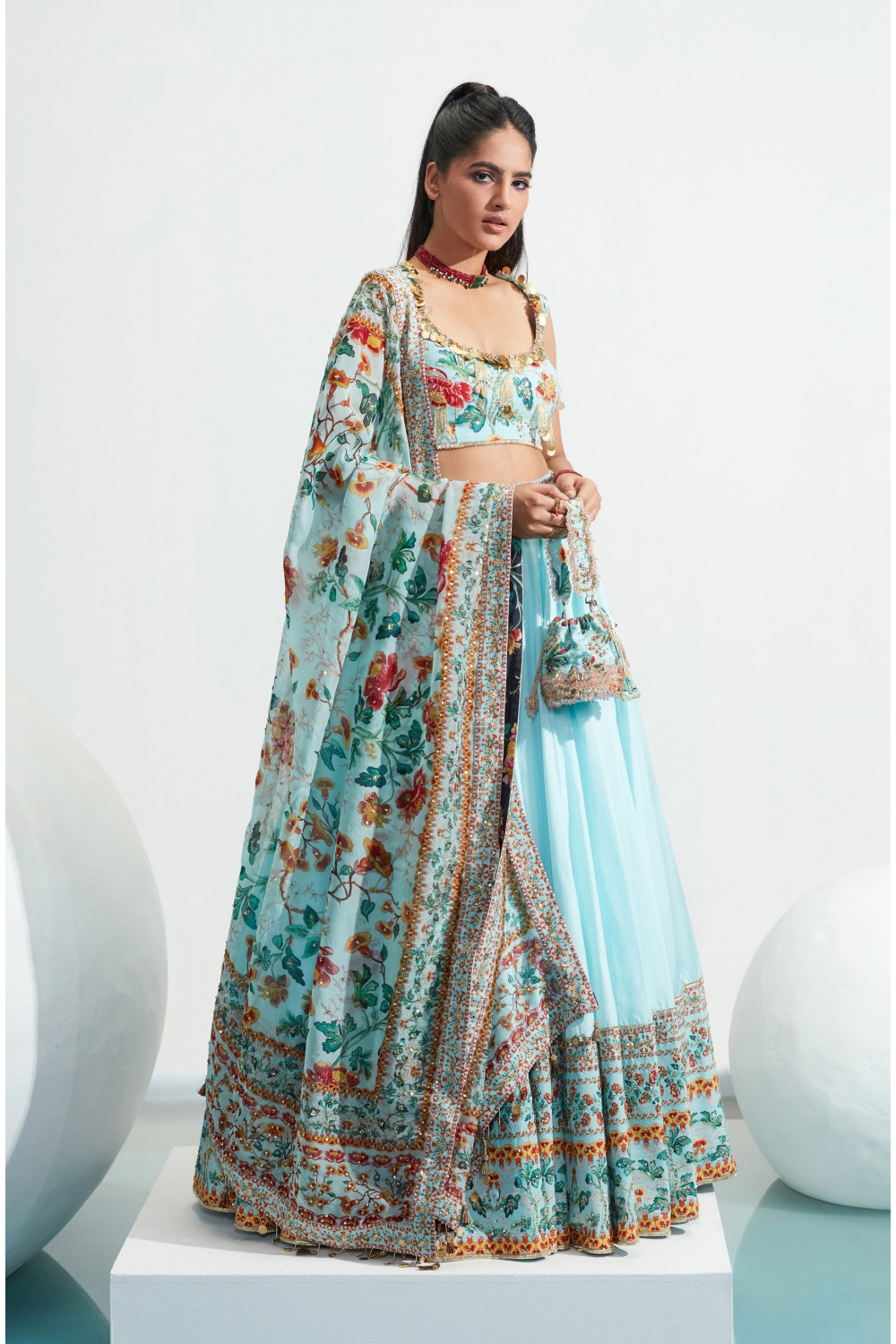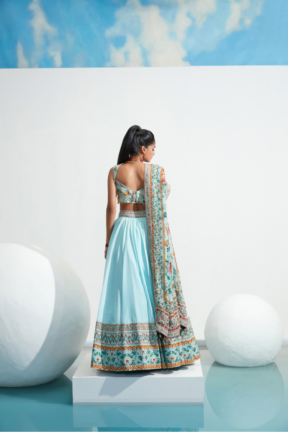 Blue embroidered lehenga in satin-organza paired with a textured-cotton embroidered blouse and an embroidered organza dupatta with tassel details at the hem