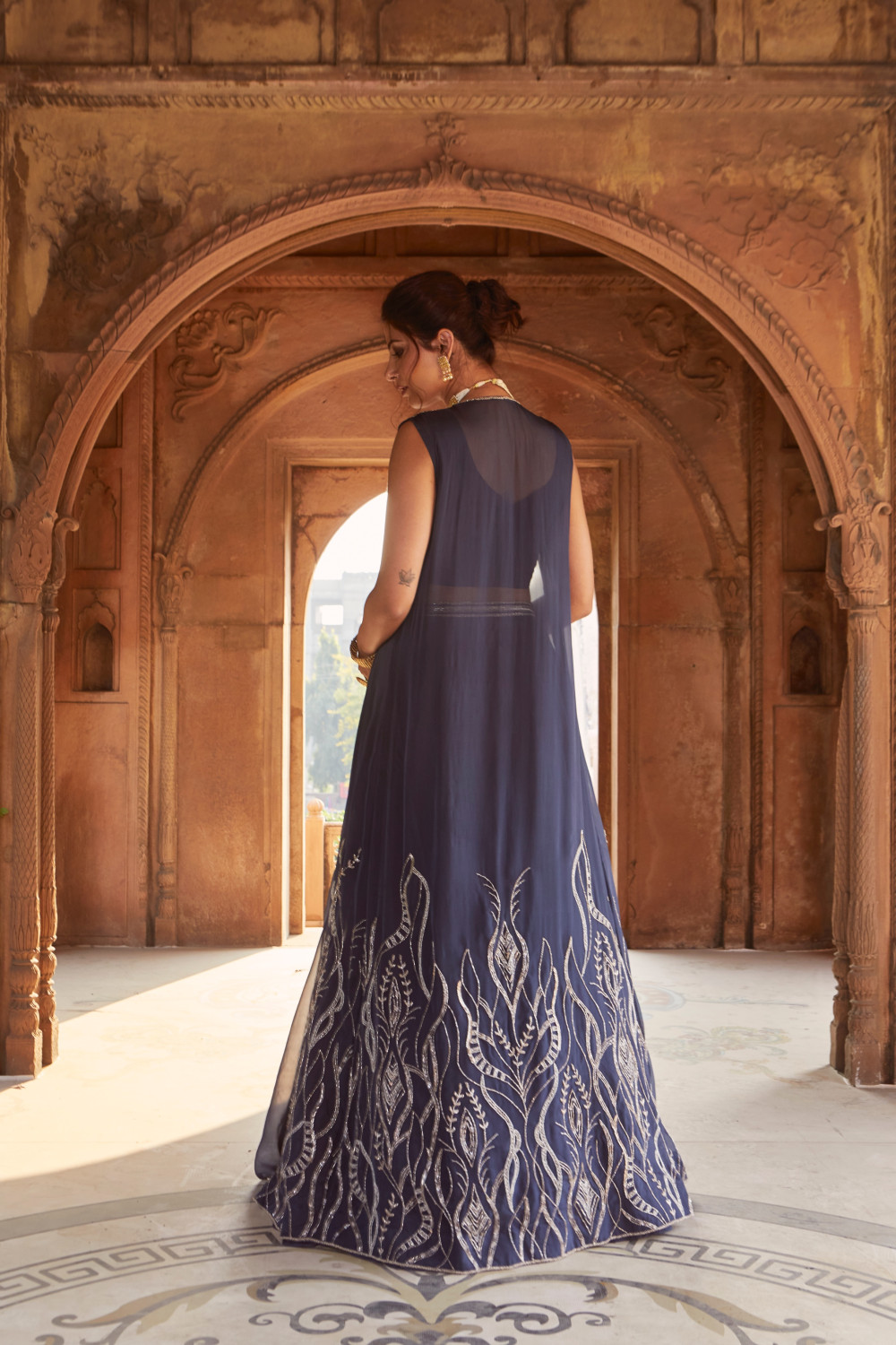 Navy-blue net jacket with curvy lines paired with a belted georgette lehenga and booti embroidered tussar blouse