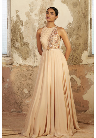 Beige crepe gown featuring 3D gold floral embellishment on one side, and a gathered detail on the ot.....