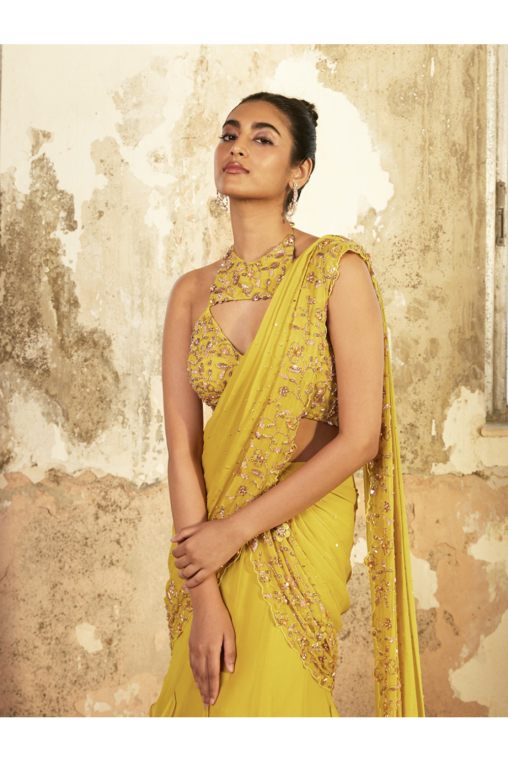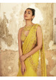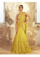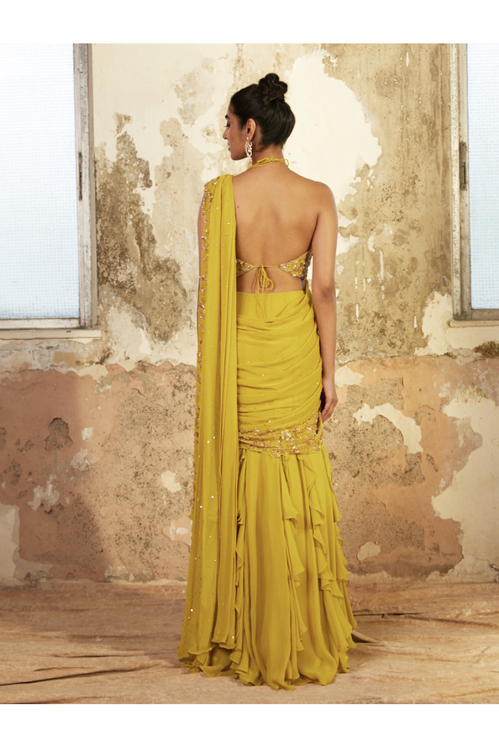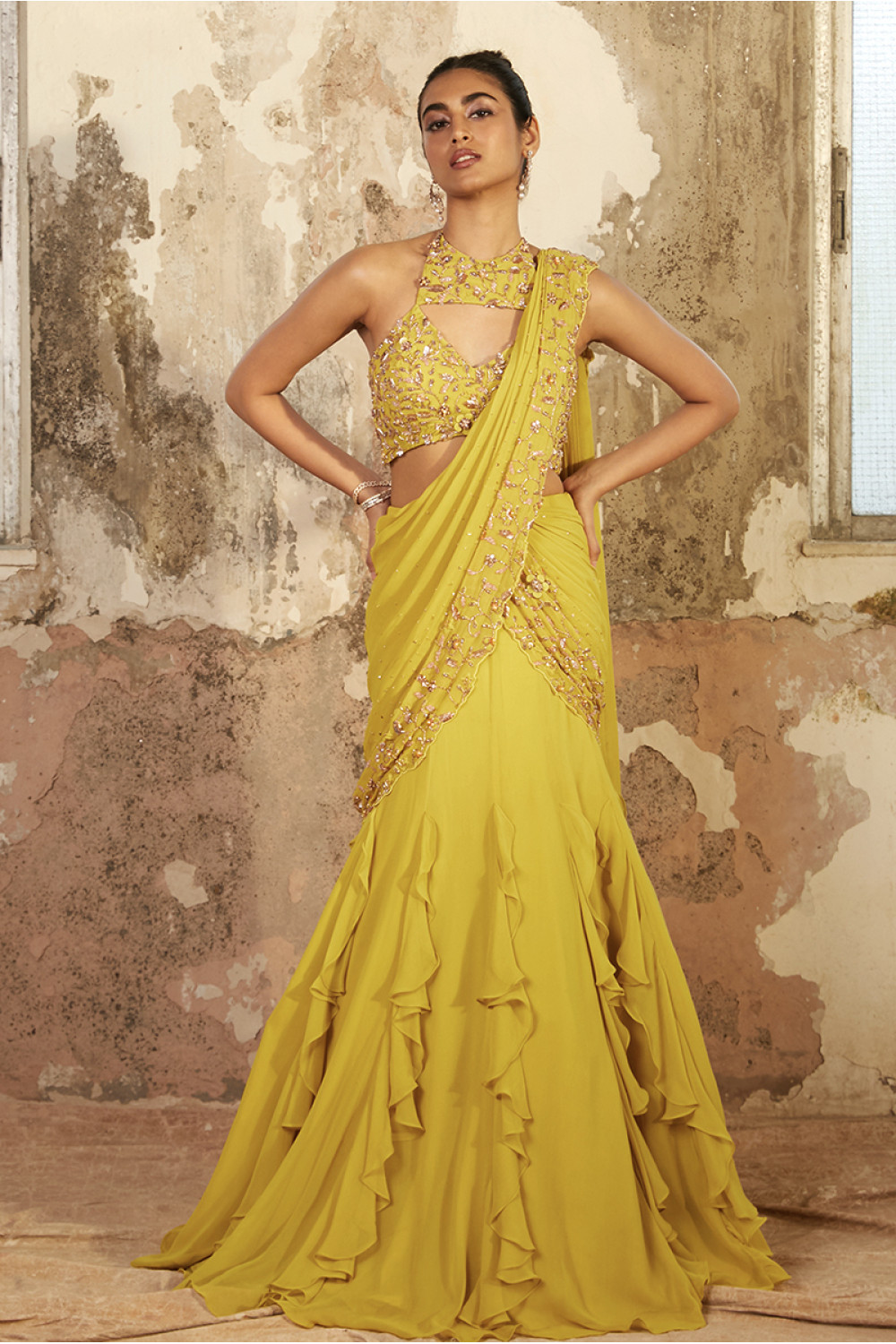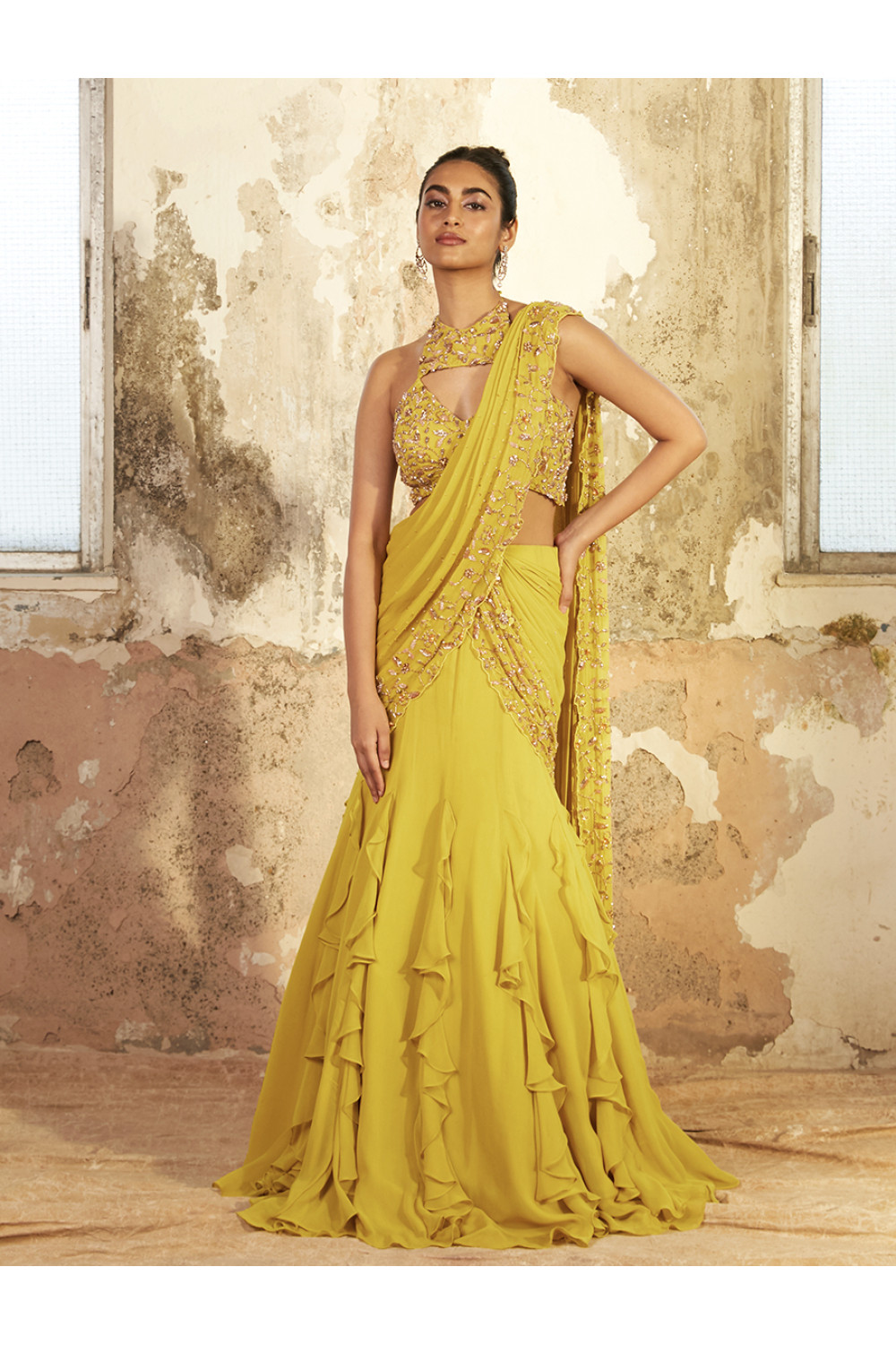 Lime georgette ruffled saree style featuring a gold hand embellished pallu and a matching crop with a tie back.