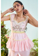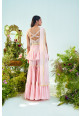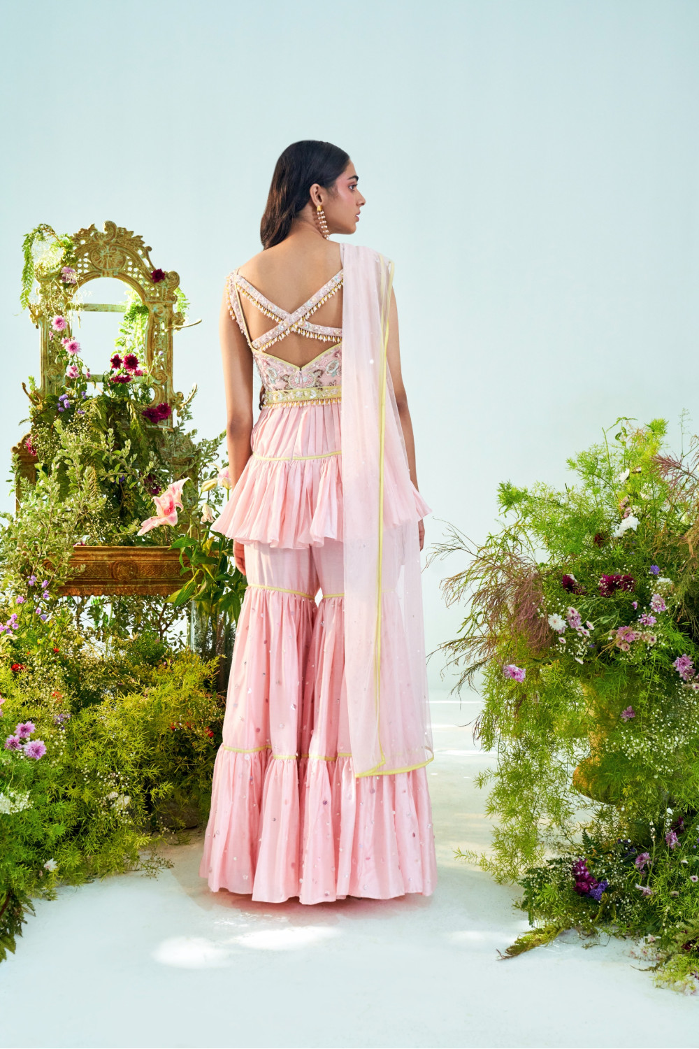 Candy-pink and lime-green cut-dana, sequin and pearl hand-embroidered peplum top with a flared gharara in pure chanderi-silk and a soft-net dupatta with cheeta and lime-green details