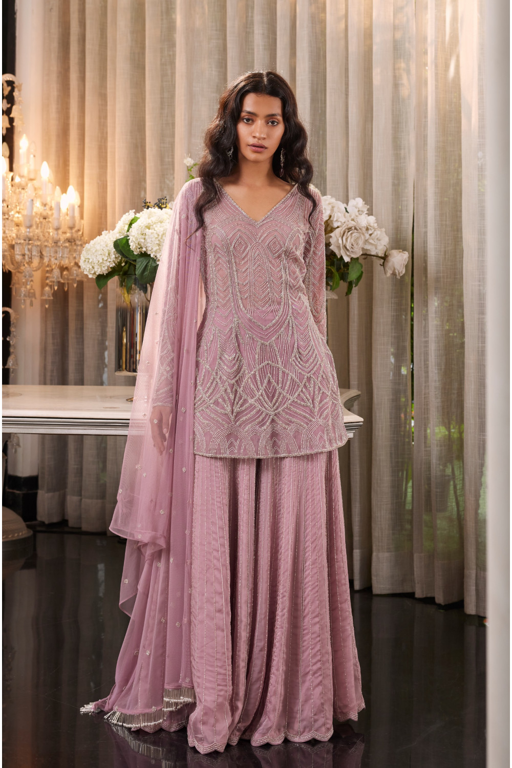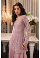 Lilac pink pyramid embroidered net kurta with a line embellished kali sharara in organza and booti dupatta in net