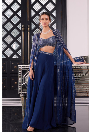 Electric-blue lines and leaf embroidered shoulder cape in organza with an embellished tussar bralette and organza sharara pants with an embroidered belt