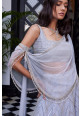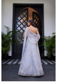 Powder-blue arch and leaf heavy net lehenga with a cowl drape net dupatta and blouse