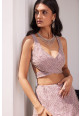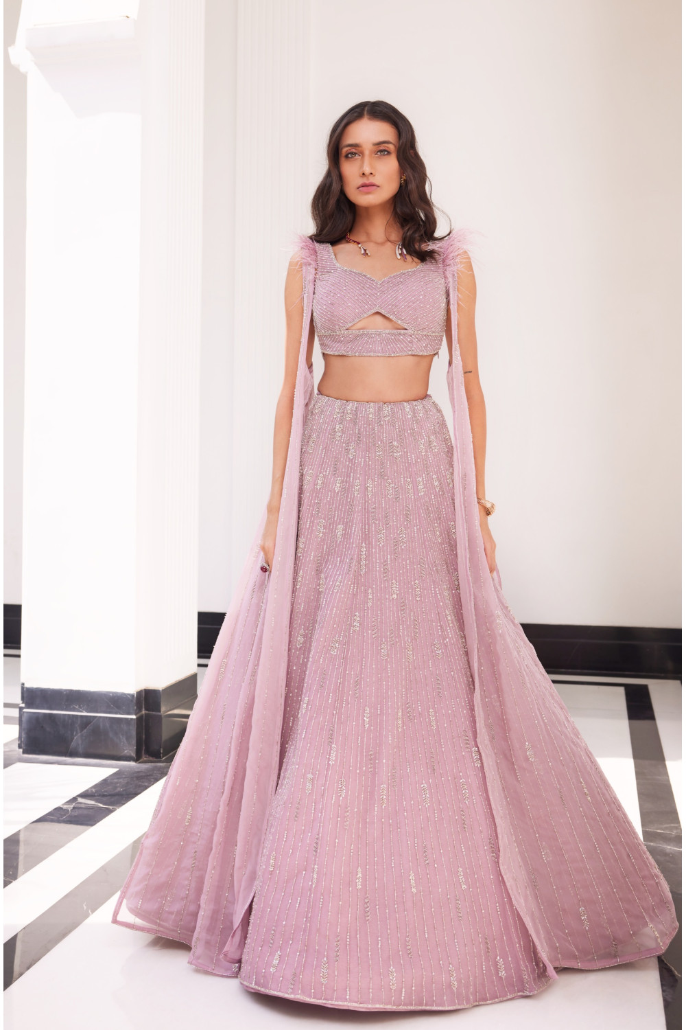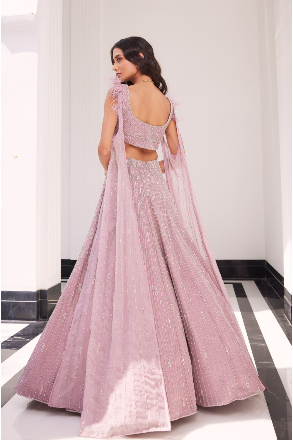 Lilac pink lines and leaf embroidered heavy net lehenga and blouse with organza shoulder drapes