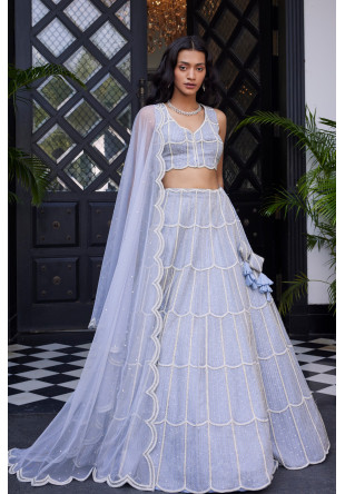Powder-blue pearl cage embroidered heavy net lehenga blouse and palla
