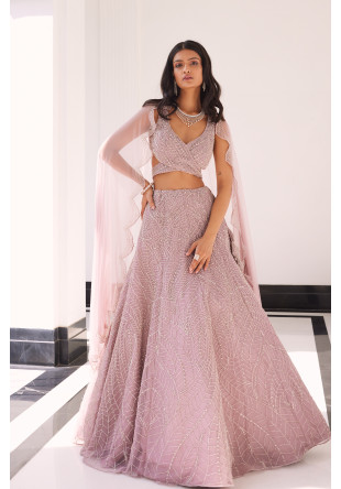 Lilac pink line embroidered heavy net lehenga blouse and palla