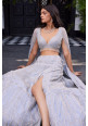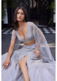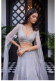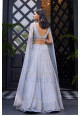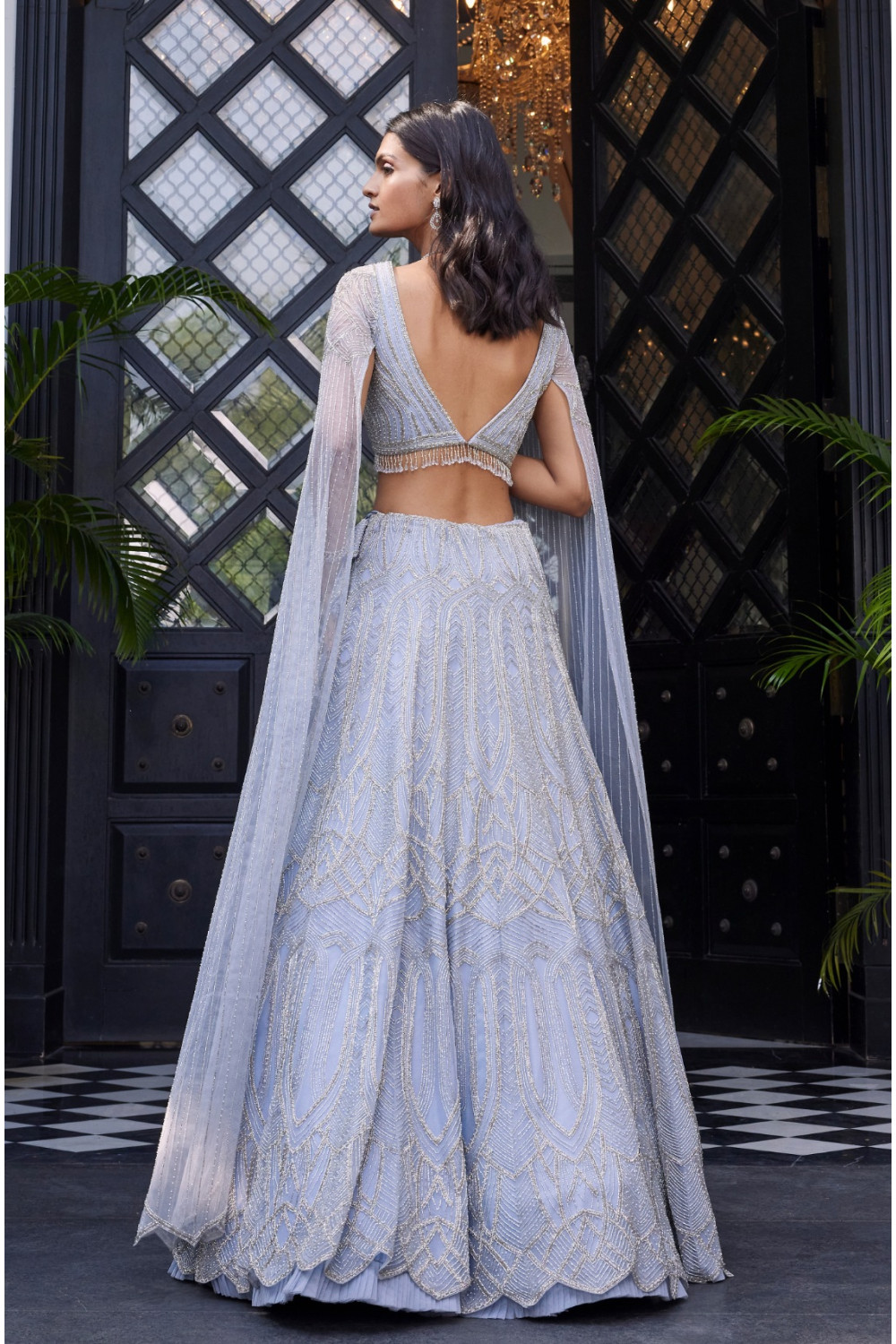 Powder-blue pyramid embroidered heavy net lehenga with a side drape net blouse and palla
