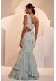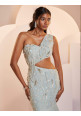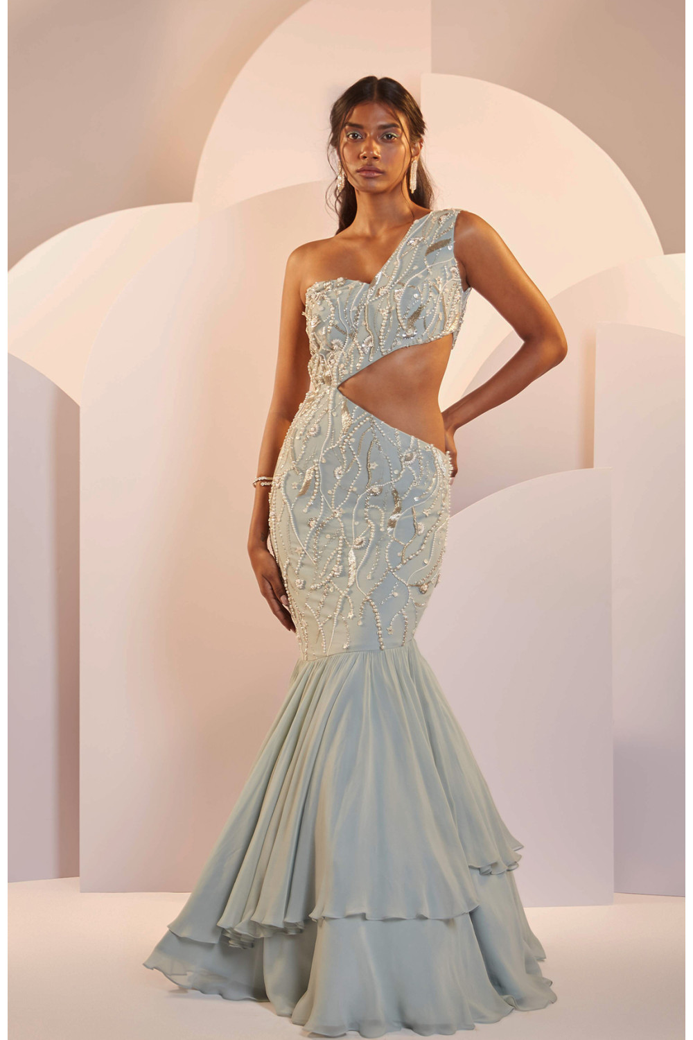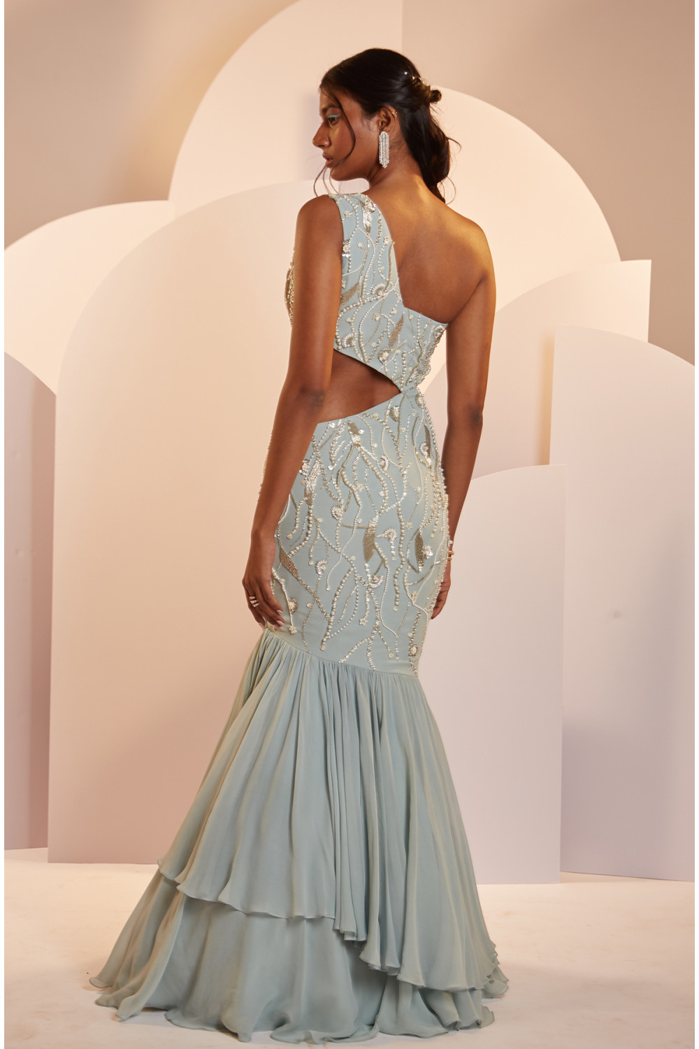 Mint green one shoulder cut out georgette gown with hand embellished pearl and silver wavy lines and fishtail bottom