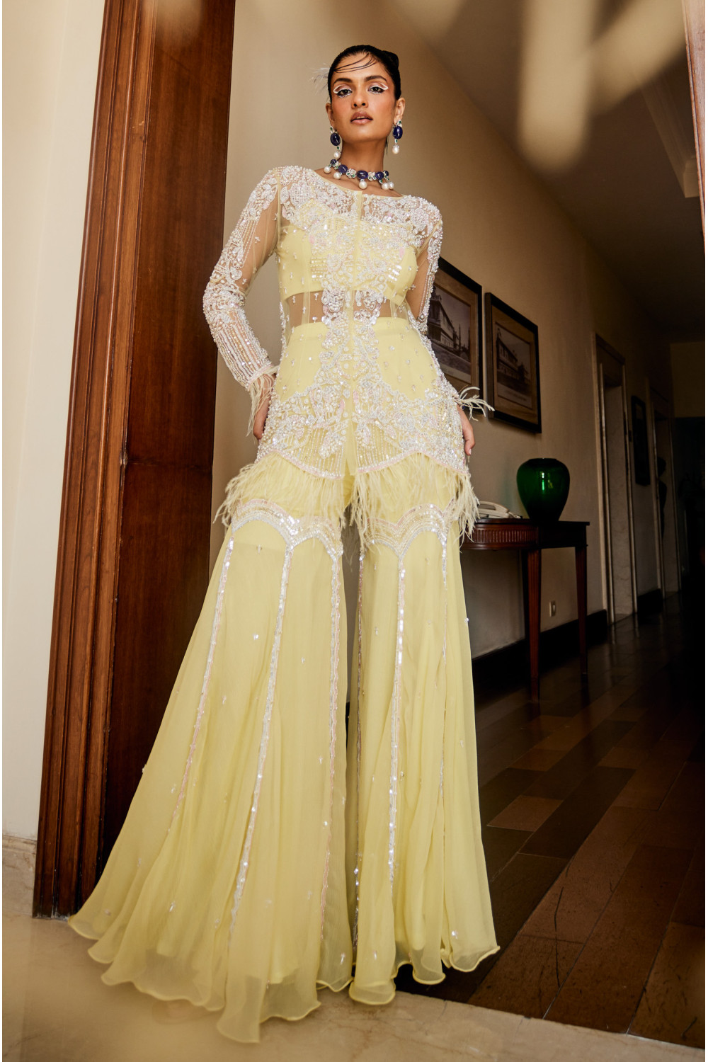 A pastel yellow embroidered jacket with a feather trim & gharara. It also includes a bustier and tassel dupatta.