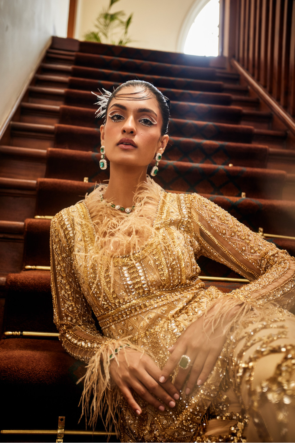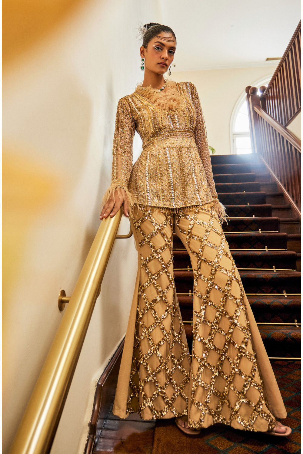 Venetian-gold embroidered peplum top with feathers on neckline and embroidered flared pants