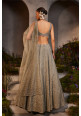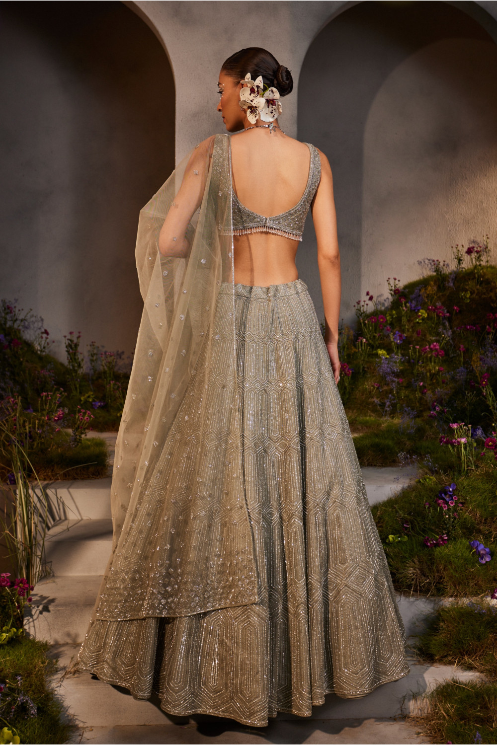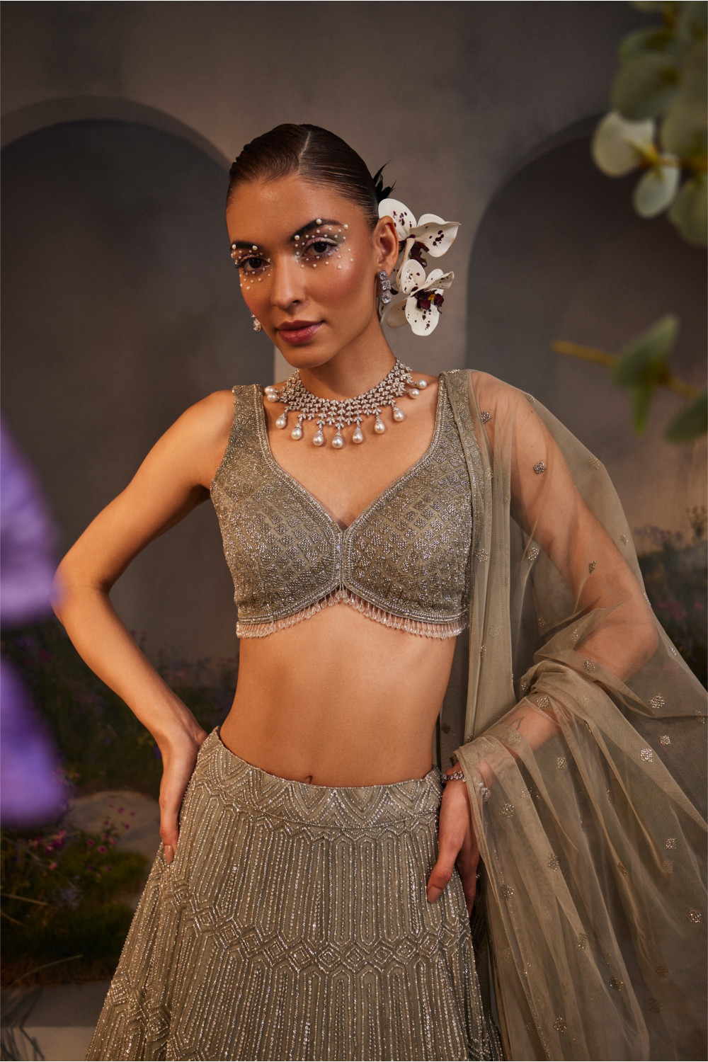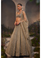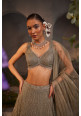 Silver-grey net lehenga with geometric embroidery with an embellished net blouse and dupatta