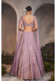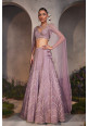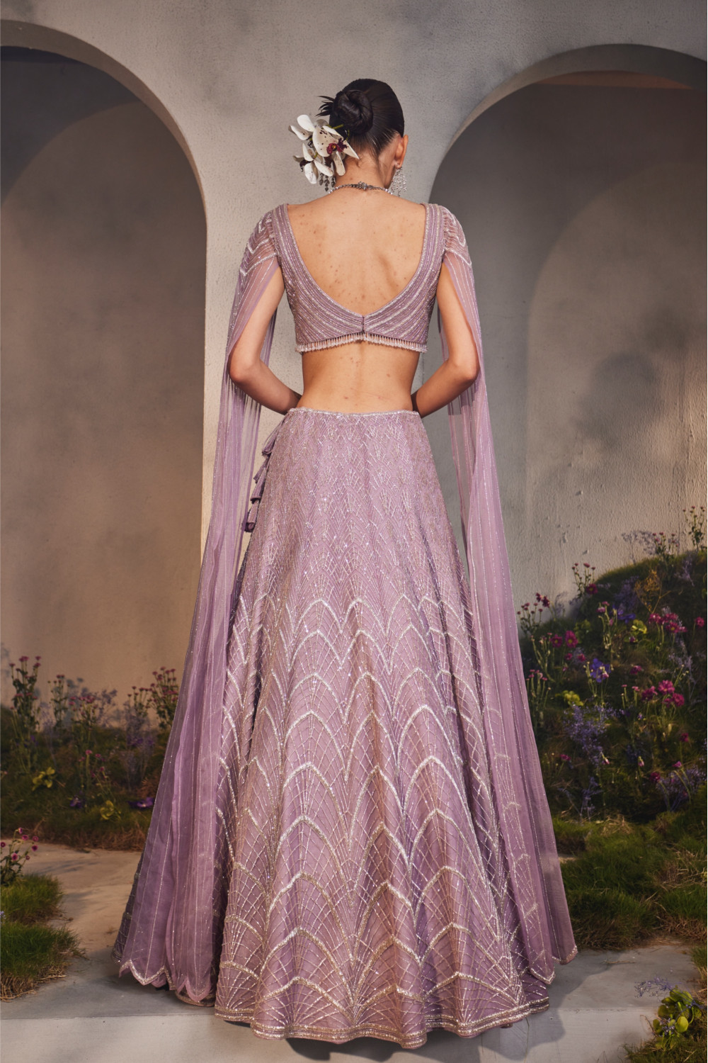 Lavender net lehenga with an arch pattern paired with a net blouse with embellished side capes