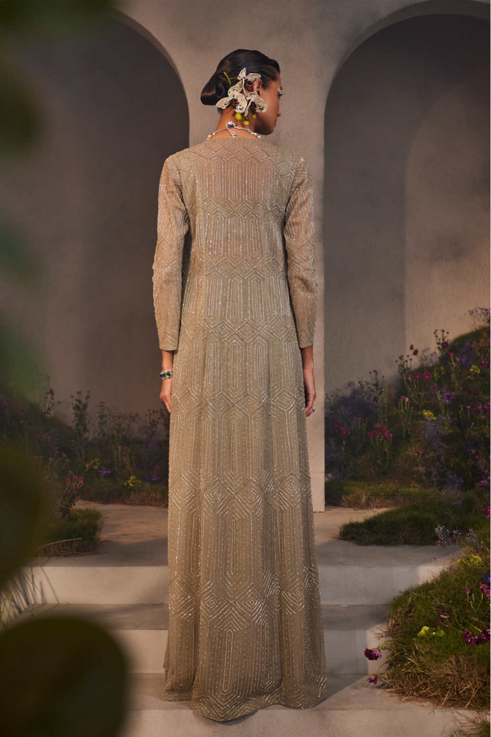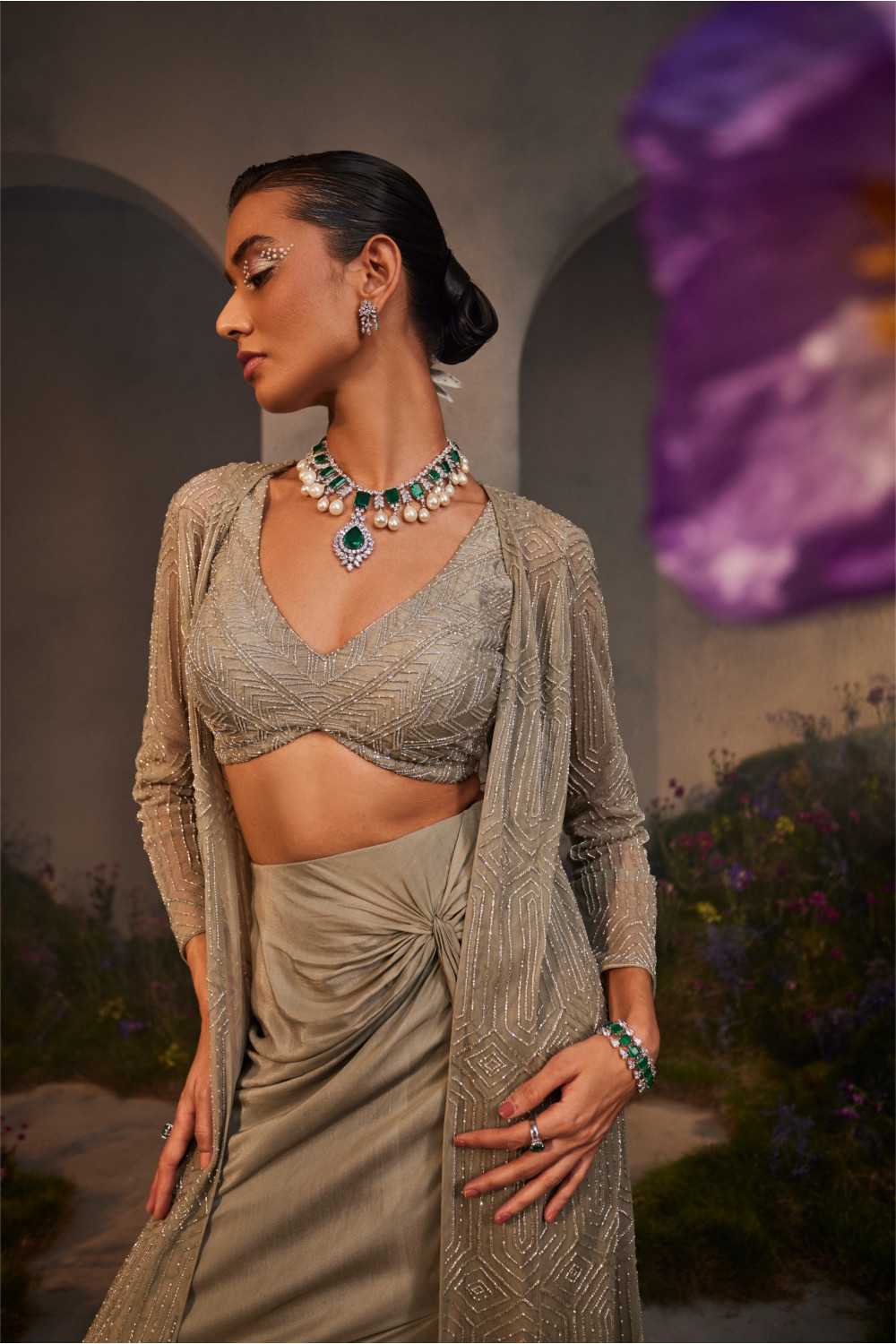 Silver-grey geometric embroidered net jacket with an embellished silk blouse and draped crepe skirt