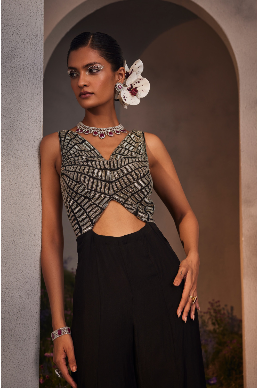 Black spokes-pattern embroidered jumpsuit with a silk yoke and organza bottom with a yoke cut-out at the front and back
