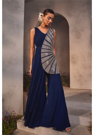 Electric –blue pre-draped georgette jumpsuit with an embellished neck and waistline with machine and.....