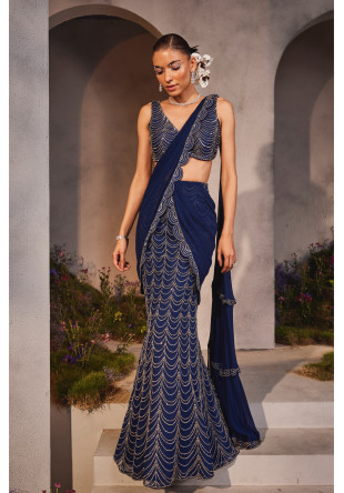 Electric-blue fish cut saree in net and chiffon paired with a silk blouse with scallop embroidery al.....