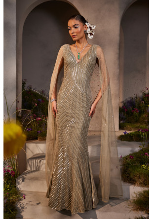 Fish- cut gown in net with zig-zag embroidery with an embellished back cape in a silver-grey