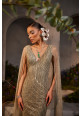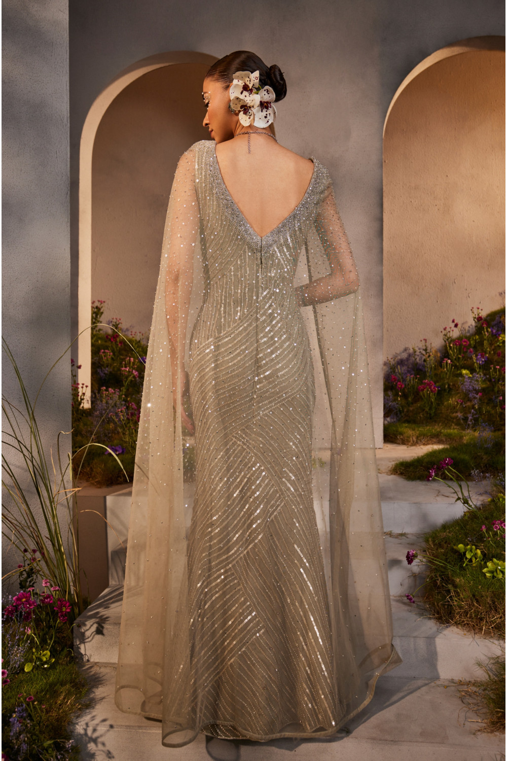 Fish- cut gown in net with zig-zag embroidery with an embellished back cape in a silver-grey