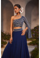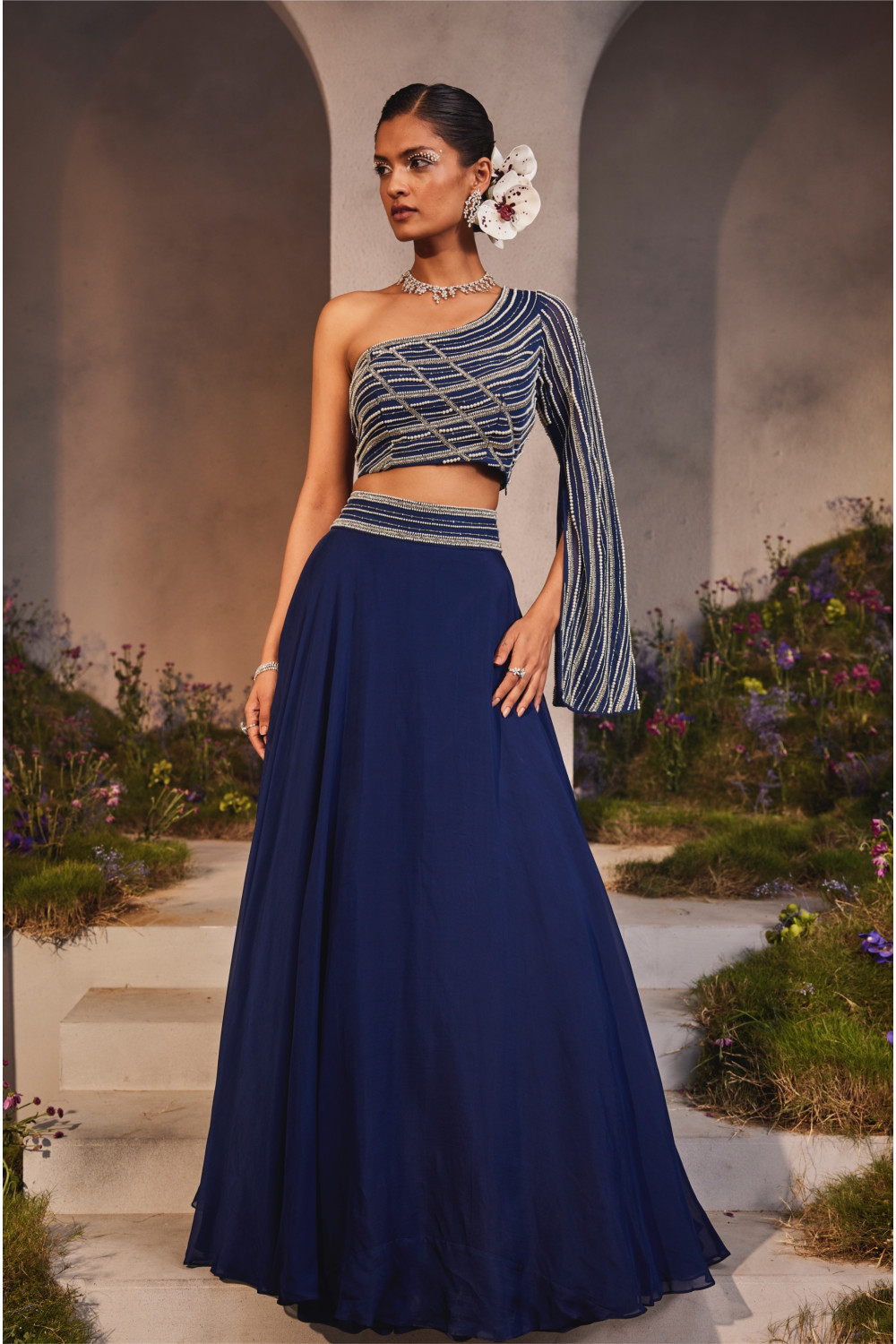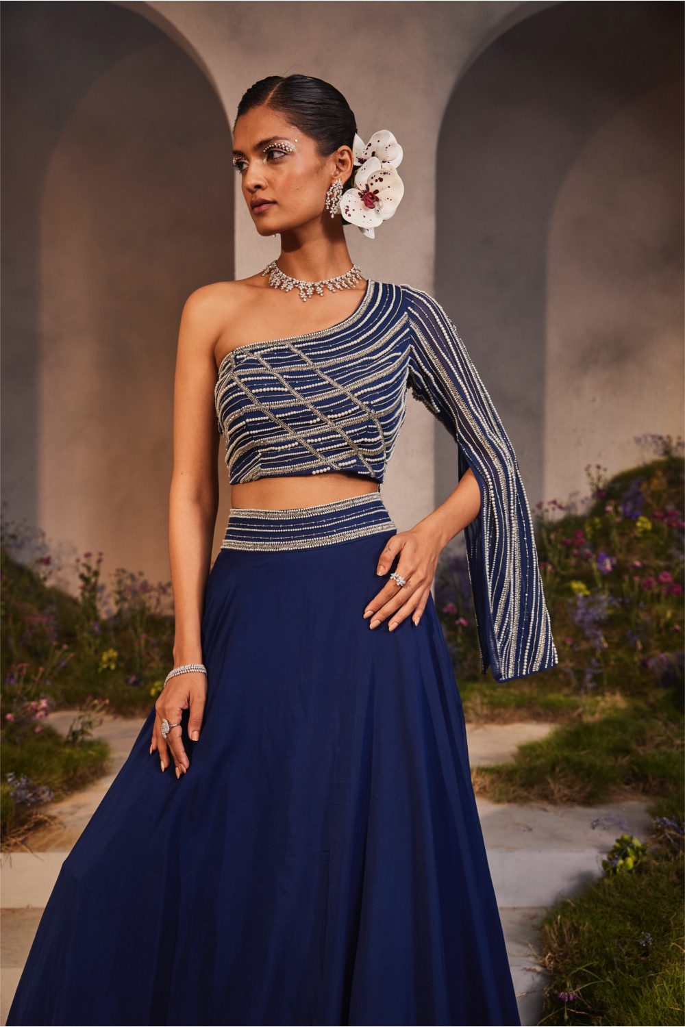 Asymmetric pearl embroidered net blouse with a bell sleeve paired with an organza skirt with an embroidered waist in an electric-blue
