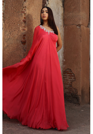 Full length asymmetrical draped chiffon kaftan in coral-pink with hand embroidered sequin, pearl, gl.....