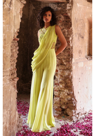 Neon green net and organza jumpsuit with flared bottoms paired with an embellished georgette paloo hand embroidered with sequin, glass bead, and crystal