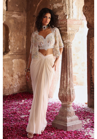 Ivory embellished organza jacket paired with a georgette choli and skirt hand embroidered with sequin, pearl, glass bead, zari, and flower applique in organza