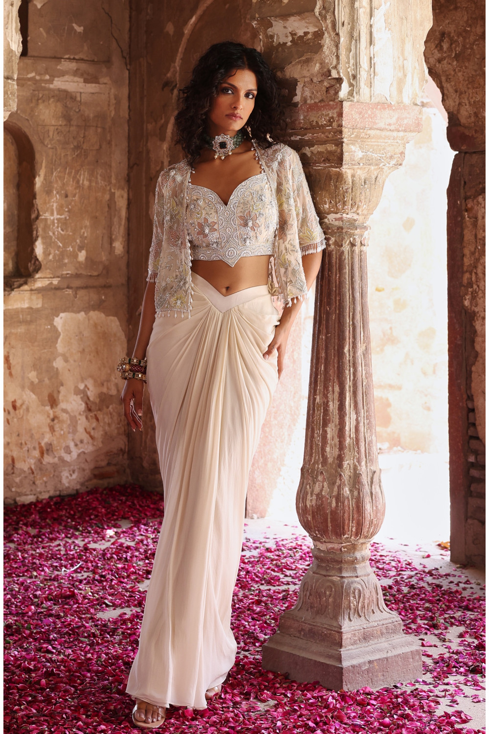 Ivory embellished organza jacket paired with a georgette choli and skirt hand embroidered with sequin, pearl, glass bead, zari, and flower applique in organza