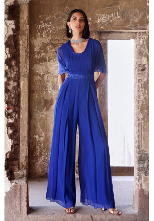 Electric –blue pre-draped georgette jumpsuit with an embellished neck and waistline with machine and hand embroidered resham-thread, sequin, glass bead, and crystal