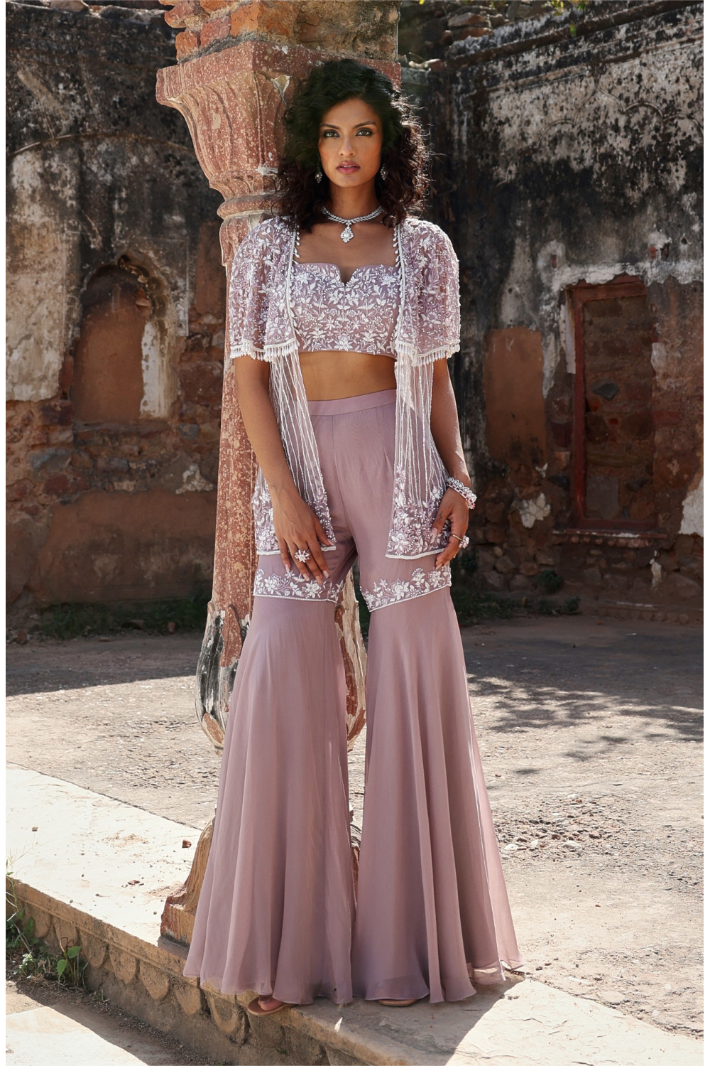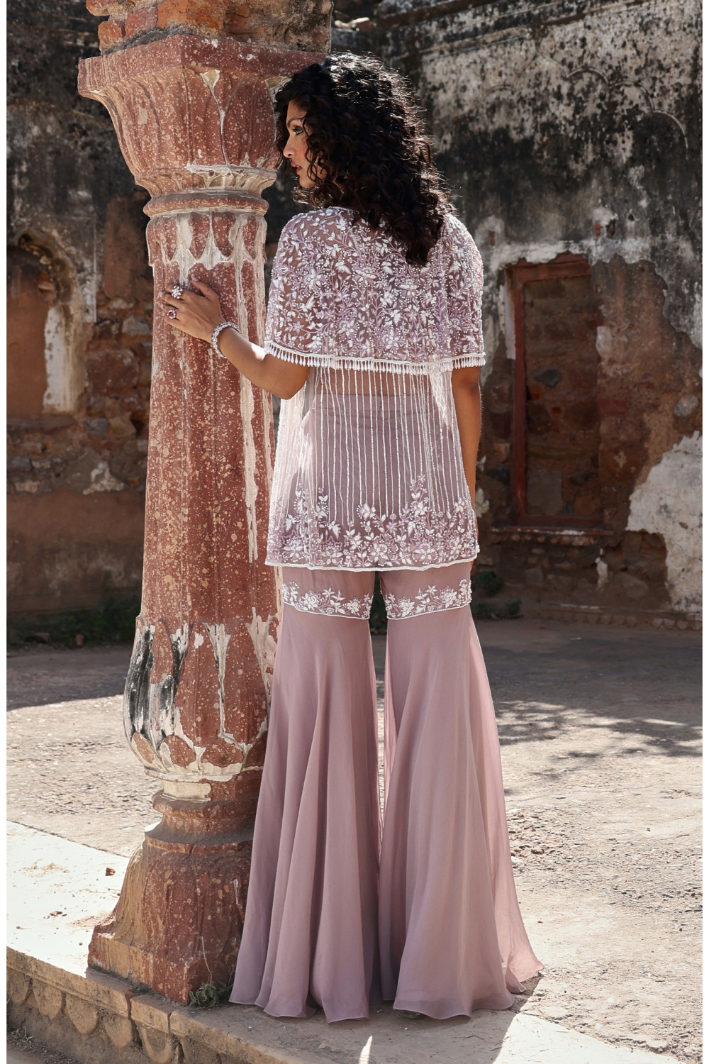 Embellished lilac georgette choli paired with an embellished net jacket with an attached cape with tassels and an organza gharara with satin lining and resham thread, mirror, glass beads and pearl machine and hand embroidery
