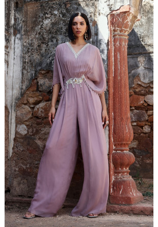 Draped and pleated lilac georgette jumpsuit with a satin lining with a hand embroidered neckline and waist in sequin, pearl, glass bead, zari, and floral applique in organza