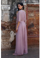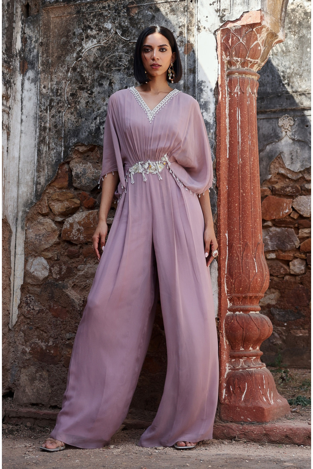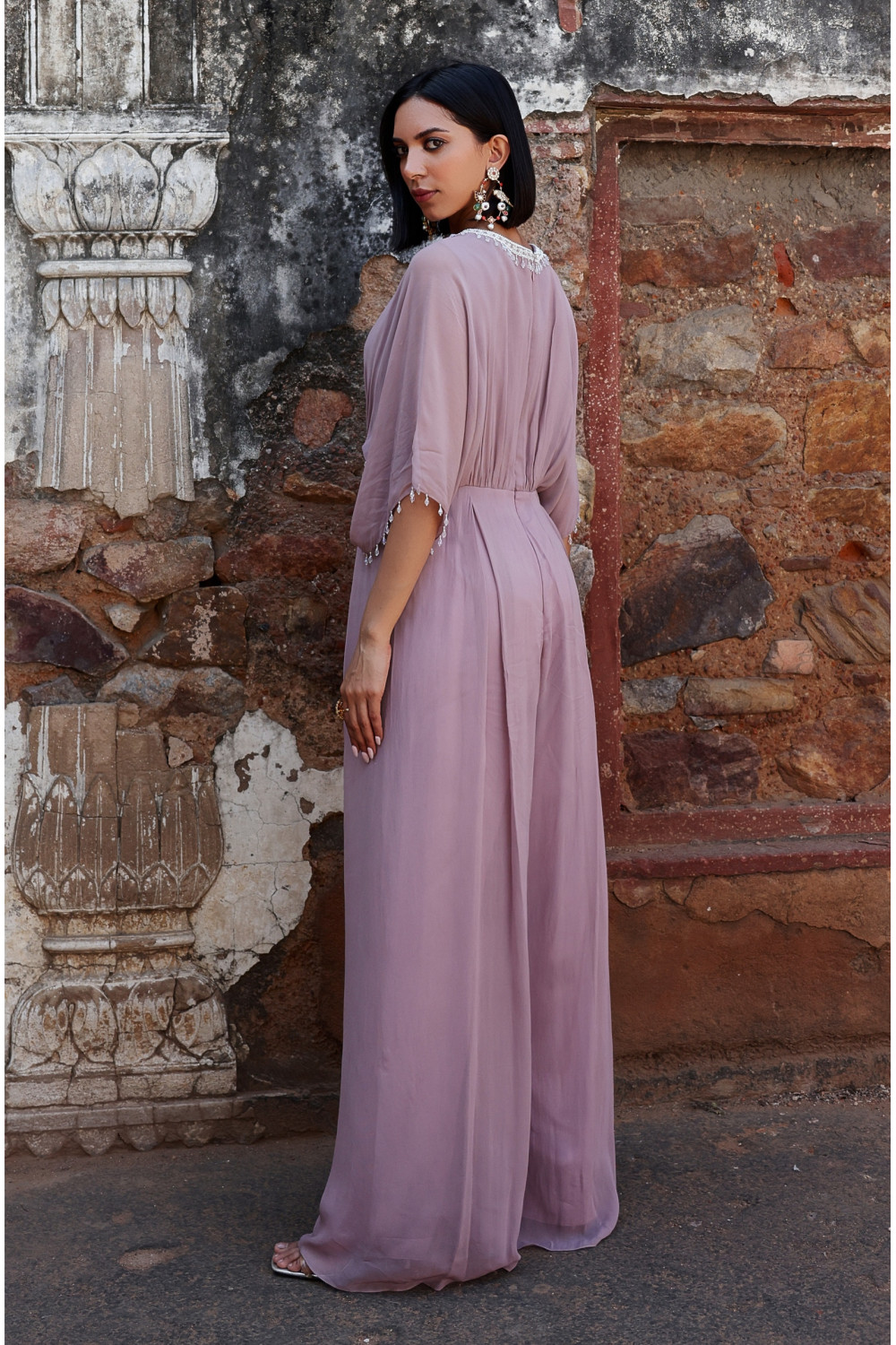Draped and pleated lilac georgette jumpsuit with a satin lining with a hand embroidered neckline and waist in sequin, pearl, glass bead, zari, and floral applique in organza