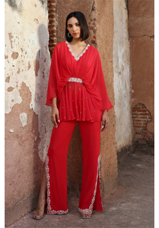 Coral-pink georgette peplum top with a hand embroidered neck and waistline in zari, sequin, glass beads, pearl and crystal paired with flared side-slit pants with matching embroidery