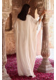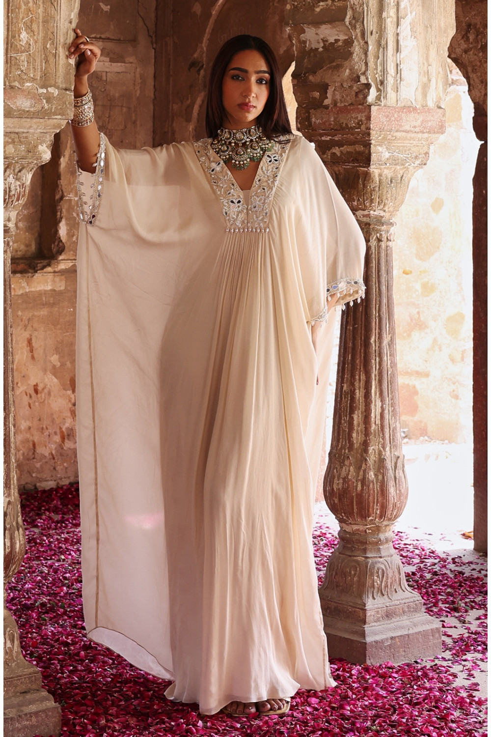 Embellished ivory full-length draped kaftan in chiffon with machine and hand-embroidered resham thread, mirror, glass bead and pearl