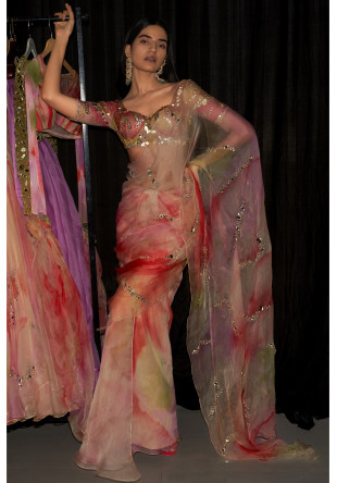 Organza rang-print pre-draped saree with an embroidered blouse .....