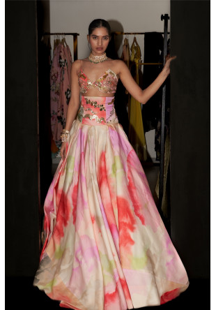 Satin rang-print lehenga and embroidered blouse with an organza dupatta
