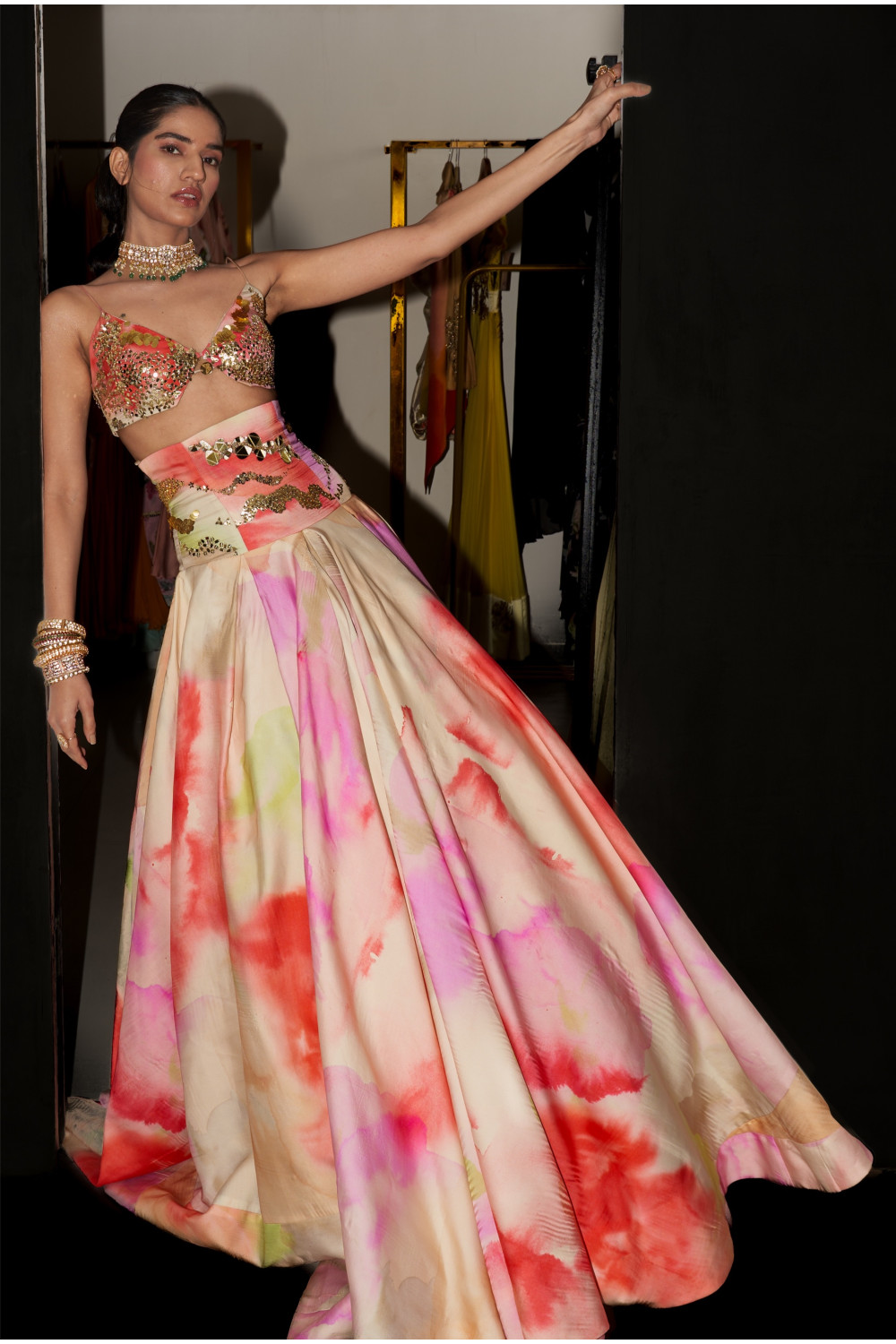 Satin rang-print lehenga and embroidered blouse with an organza dupattaCareDry clean onlyShippingShipping takes 7-8 weeks to deliver item to the country of destination. Buyer is responsible for any tax or duty required to ship to their country.
