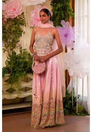 Pink and aqua organza co-ord set includes a noodle-strap designer blouse featuring a sweetheart neckline adorned with precious hand-embroidery and mirror work. It is paired up with sharara pants adorned with cords and tassels flowing from them, along with embroidery at the bottom and waistline. The style is complemented with an organza stole.