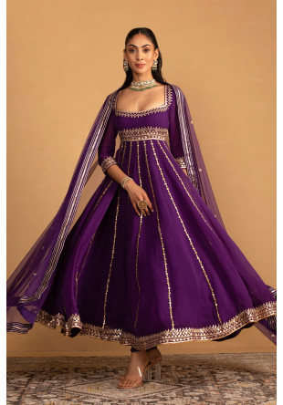 Purple anarkali in georgette with a u-shaped neckline with gota-work paired with a net dupatta and chudidhar pants in crepeCareDry clean onlyShippingShipping takes 5-6 weeks to deliver item to the country of destination. Buyer is responsible for any tax or duty required to ship to their country.