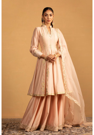 Peach chanderi peplum top and skirt with gota-work paired with an organza dupatta" data-pin-config="none" data-pin-do="buttonPin" data-pin-color="white">
