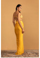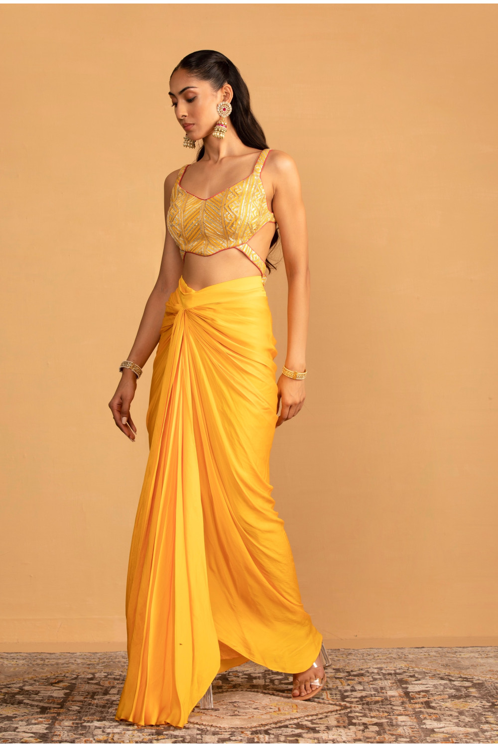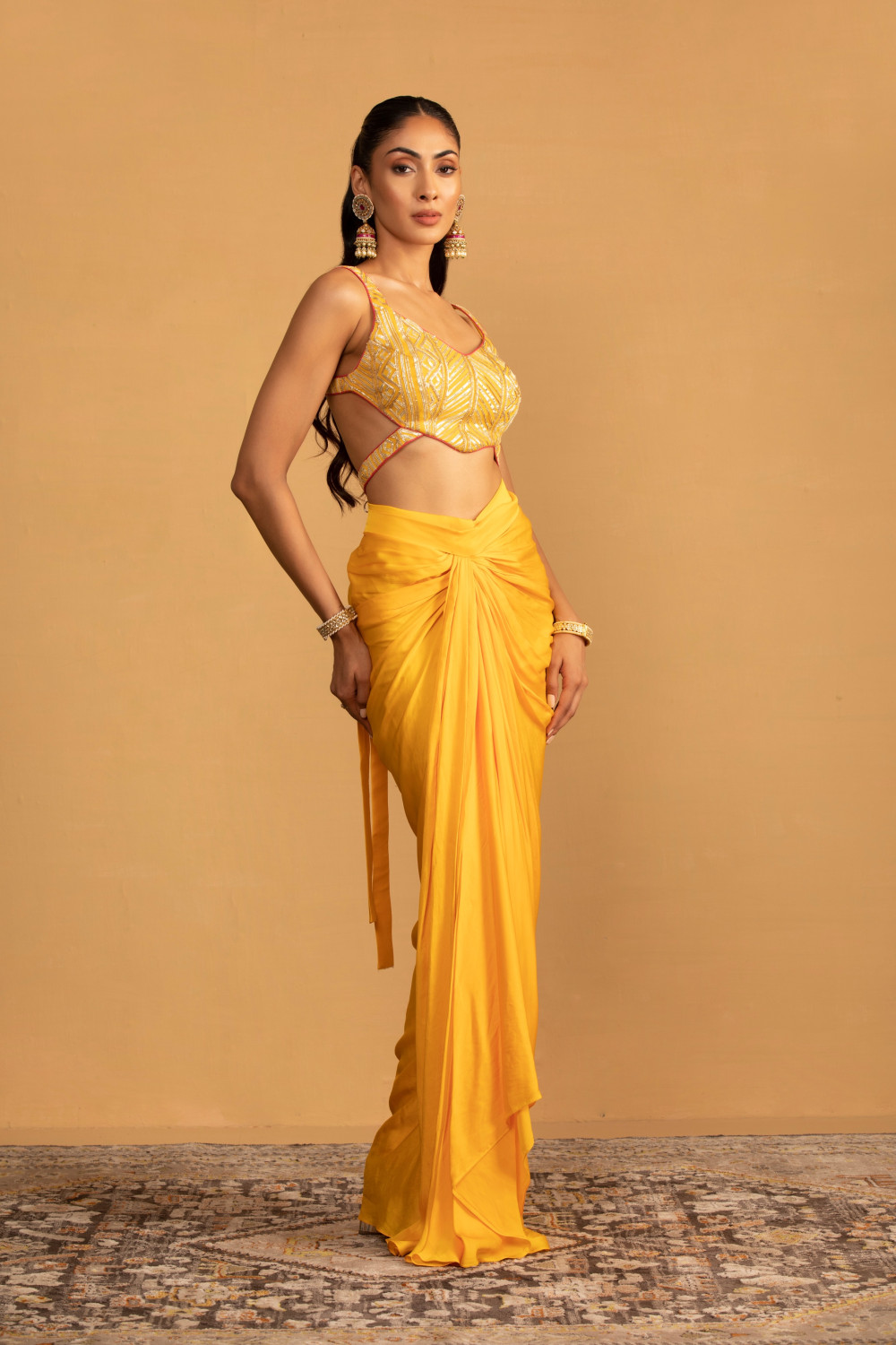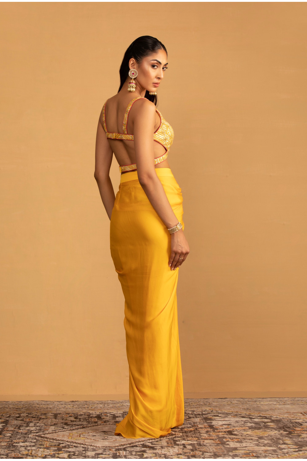 Yellow dhoti set with gota-work top in georgette and a pre-draped dhoti in satin-georgette
