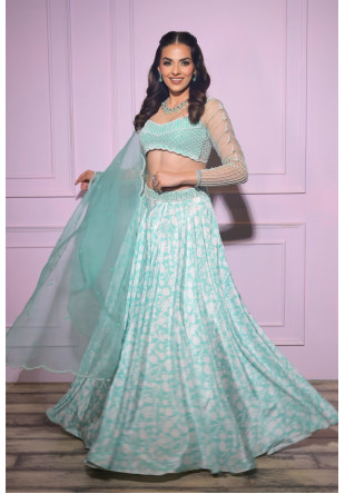 Sea green pearl embroidered blouse with full sleeves in net paired with a printed lehenga in crepe and a organza dupatta with cutdana and pearl embroidery
