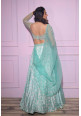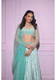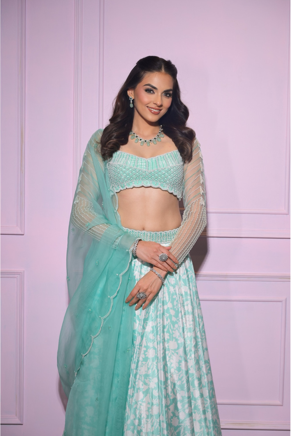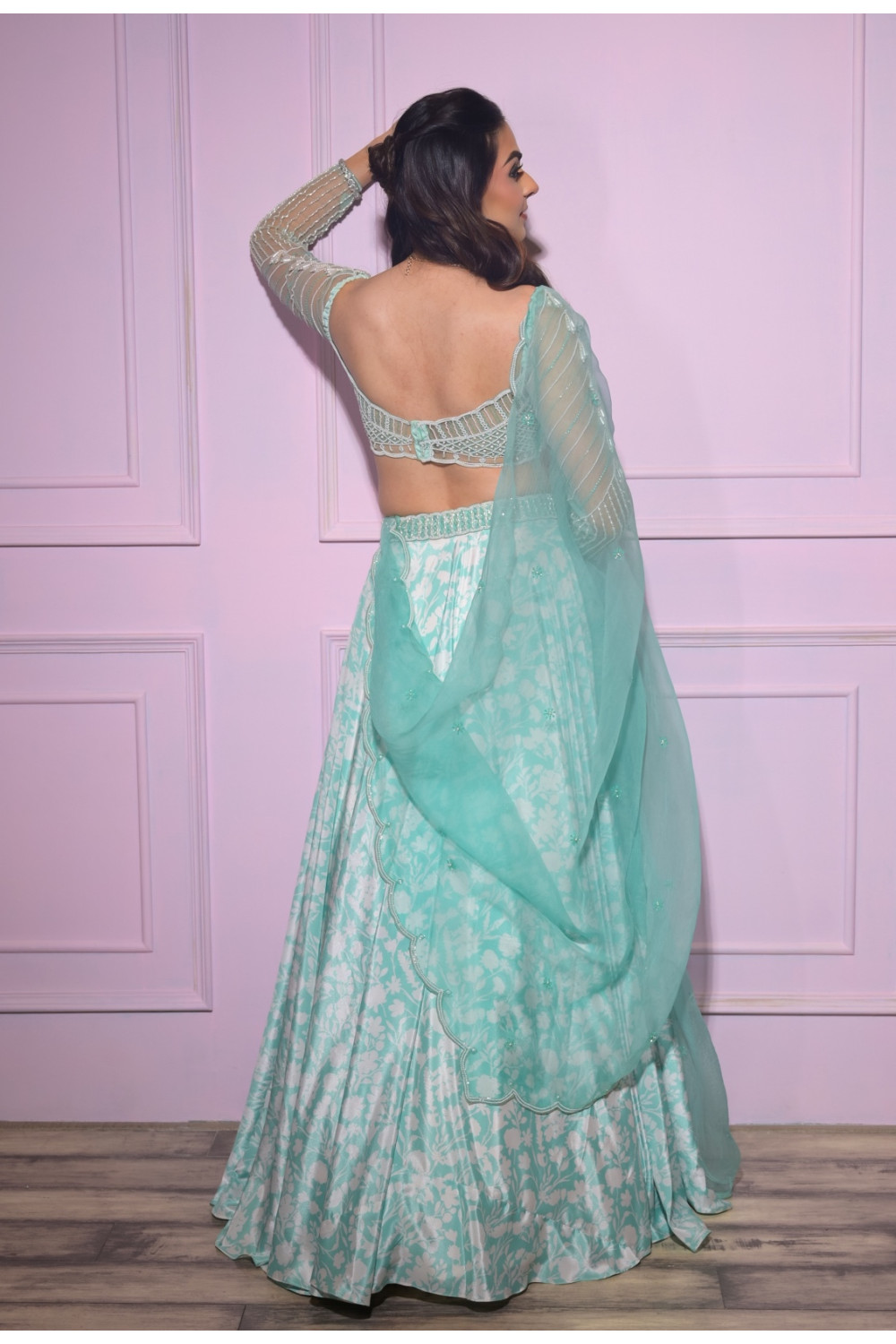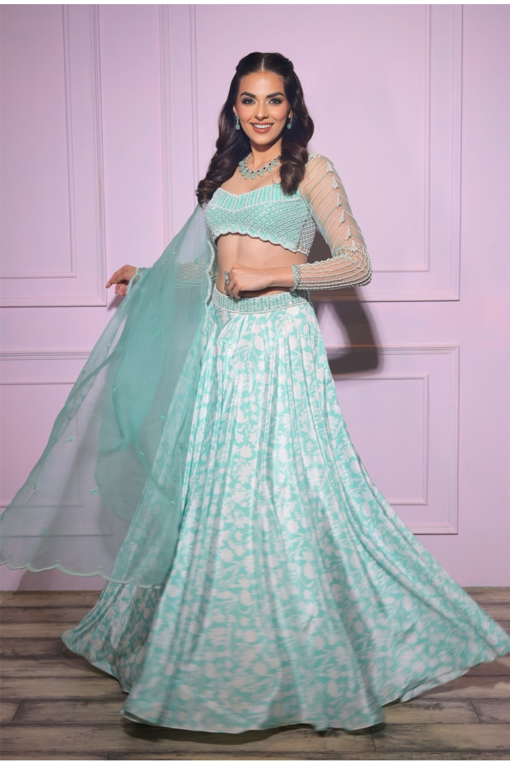 Sea green pearl embroidered blouse with full sleeves in net paired with a printed lehenga in crepe and a organza dupatta with cutdana and pearl embroidery