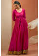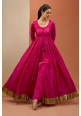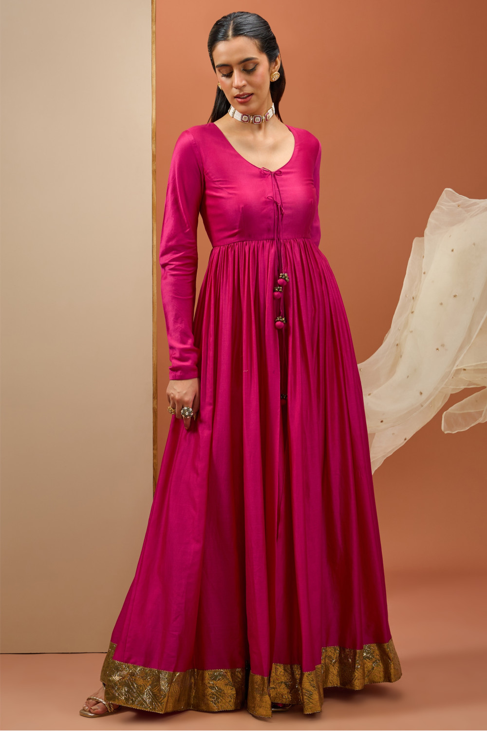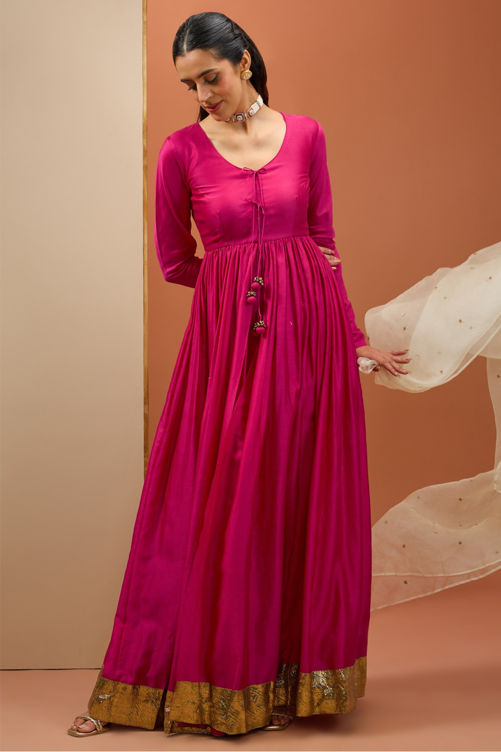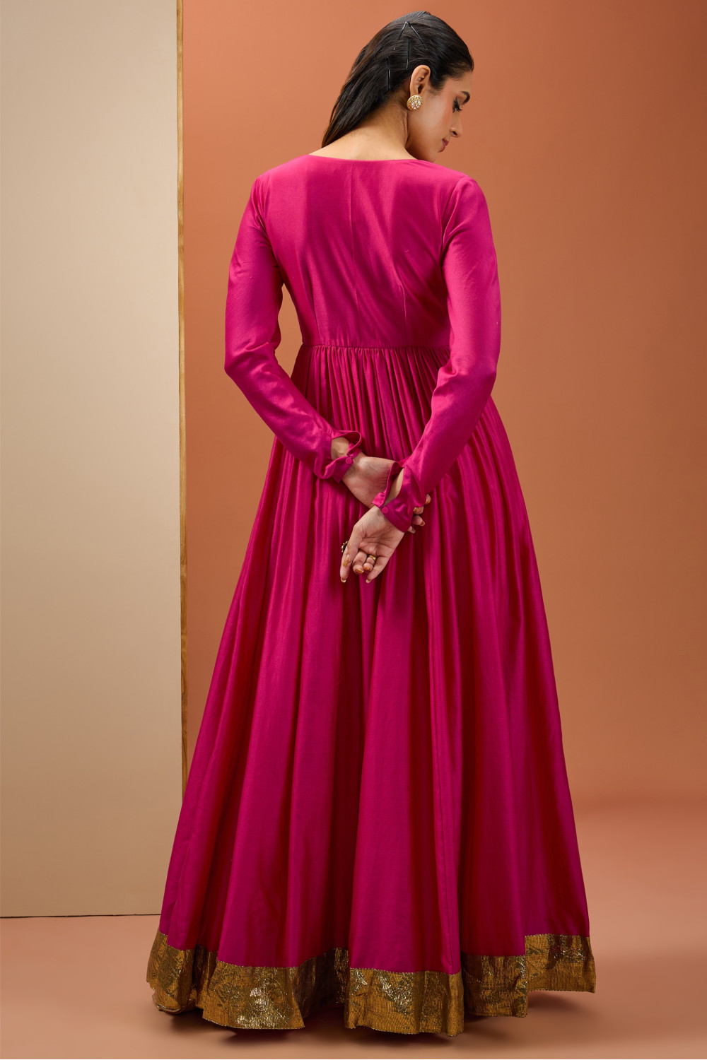 Hot-pink anarakli in chanderi and cotton with a lampi hemline paired with loose pants